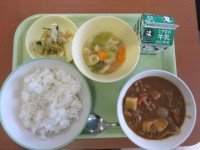 今日の献立は、ごはん、牛乳カレーライス、福神和えフルーツゼリーミックス です。カレーライスは、給食メニューの中で、トップクラスの人気。ほとんど残らず、美味しくいただきました。