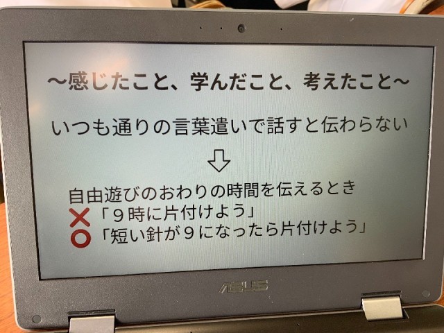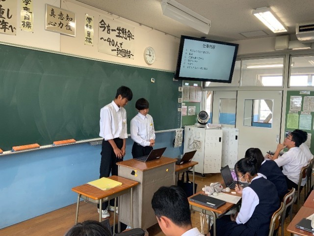 各事業所ごとにスライドを作成し、仕事内容や楽しかったこと、大変だったこと、今後頑張って行きたいことを伝えてくれました。実演を交えたり、スライドを工夫することで5日間の学びを一生懸命伝えようと頑張っていました。また、聞く側も興味を持って真剣に聞いていました。