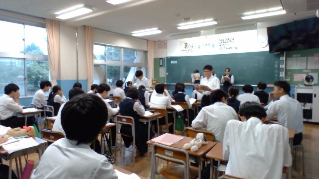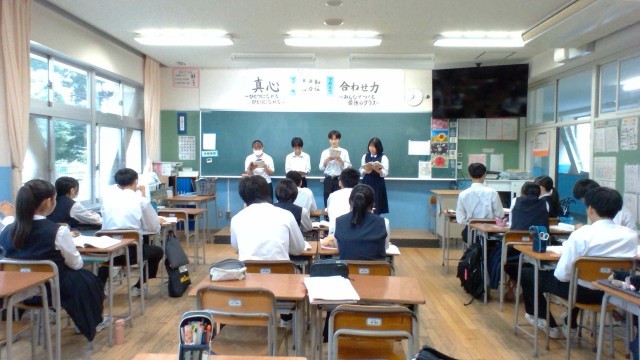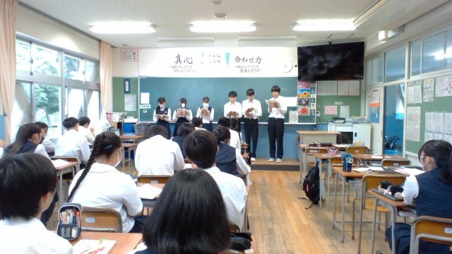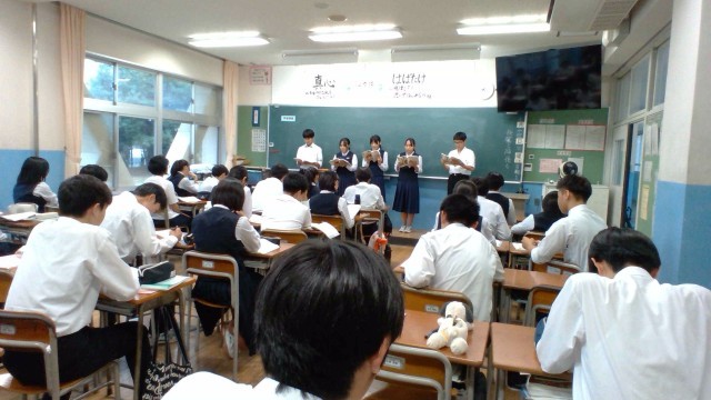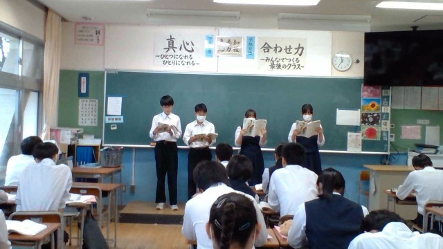 島崎藤村の有名な文語定型詩「初恋」で、群読に挑戦しました。各グループで各自の声の特徴を生かして読む部分や人数の分担を決め、聴く人が「初恋」の世界を想像しながら聴きひたれるよう工夫を凝らしていました。中には、「心の声の部分は姿を見せず廊下から言う」「二人の距離が近づくことを少しずつ移動して声が近づいていくことで表現する」「前と後ろの掛け合いを取り入れる」など、空間も効果的に利用した発表もありました。