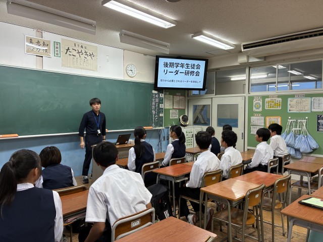 放課後に、前期と後期の学年生徒会のメンバーが集合し、リーダー研修会を行いました。