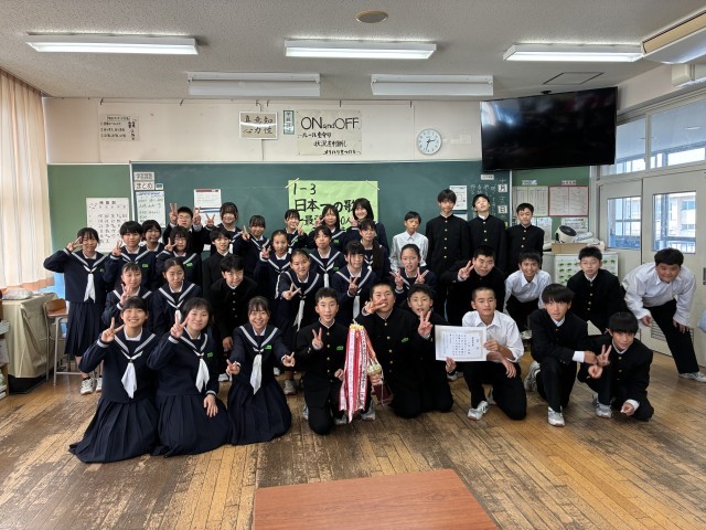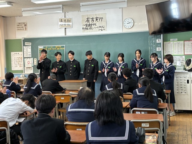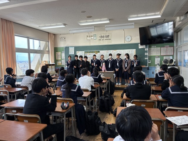 合唱コンクールが終わった後の学活の様子です。1年生の教室を覗くと、合唱を引っ張ってくれた実行委員やリーダー、指揮者、伴奏者から、みんなへの感謝の言葉を伝える場面でした。うまくいかないことを乗り越えて、つくりあげた合唱は聴いている人を感動させてくれました。