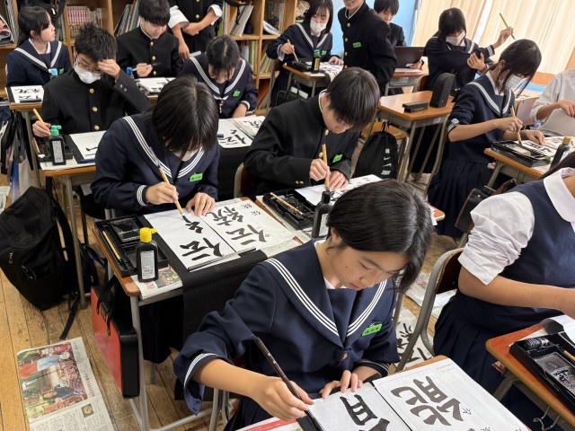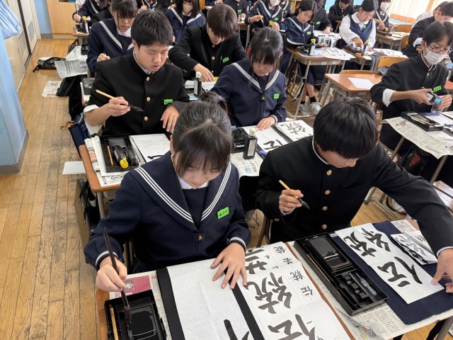 1年生では、「伝統芸能」の書き初め練習に取り組みました。