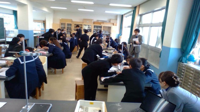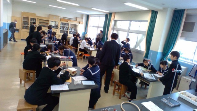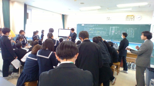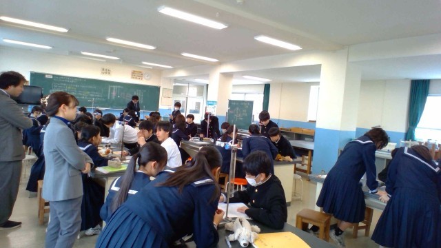 1月29日(木)初任者研修会 公開日 2026/01/29 更新日 2026/01/29 その他 5限に1年5組の理科で、初任者研修会の授業公開を行いました。生徒たちは課題解明のため、グループで協力しながらばねに重りを順番にぶら下げて、伸びた長さを測定・記録していました。 +1