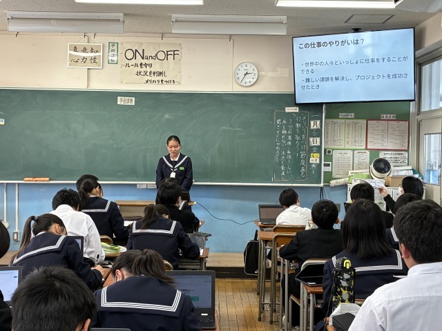 1月30日(金)1年生 職業調べ発表会 公開日 2026/02/02 更新日 2026/01/30 1学年 冬休みの宿題で、身近な人の職業について調べてきたものをスライドにまとめ、グラス内で発表会をしました。調べたものは1つですが、みんなの発表を聞くことで40近くの職業について学ぶことができました。来週はクラスの代表者の発表会を体育館で行います。そして、2月5日に実施される「夢発見13歳の自分探し」に繋げたいと思います。 1年生 2年生 3年生 学校行事 授業参観 PTA