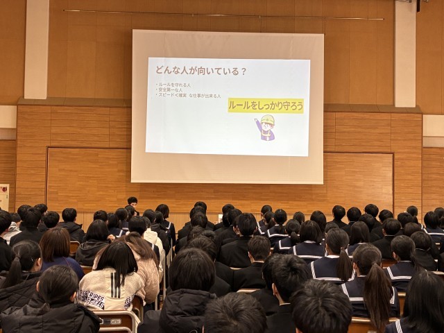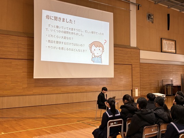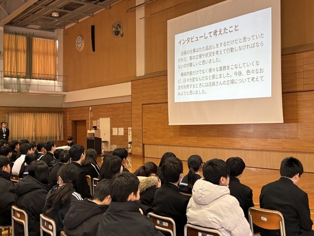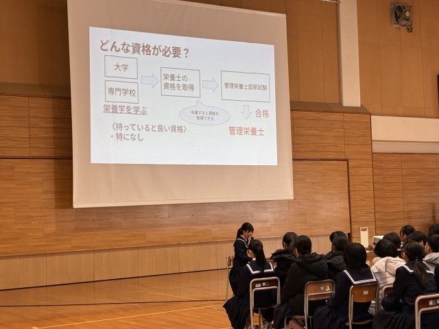 2月2日(月)1学年 職業調べ学年発表会 公開日 2026/02/03 更新日 2026/02/02 1学年 職業調べ発表会のクラスの代表に発表をしてもらいました。わかりやすいスライドを使い、調べた職業について細かく発表してくれました。今日聞いた職業につくために中学生が今、身に付けておかなければならない力についても、代表のみんなから教わりました。本当に素晴らしい発表でした。 +3 1年生 2年生 3年生 学校行事 授業参観 PTA