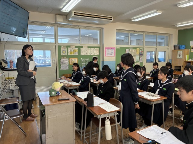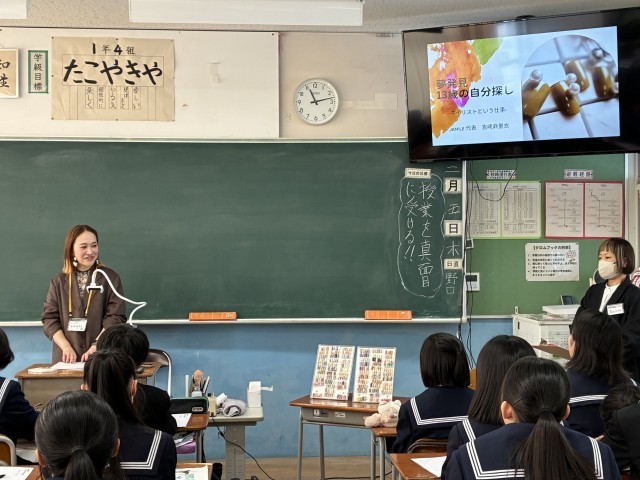 3講座目はネイリストさんでした。「ネイルを通して、お客様を笑顔にしたい」と言っておられました。実際にネイルをしているところのデモンストレーションも見せて頂き、生徒達はとても興味津々でした。中学生に「努力が実らなくてもあきらめずに頑張ることが大切だよ」と教えてくださいました。