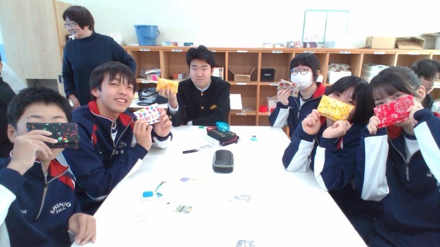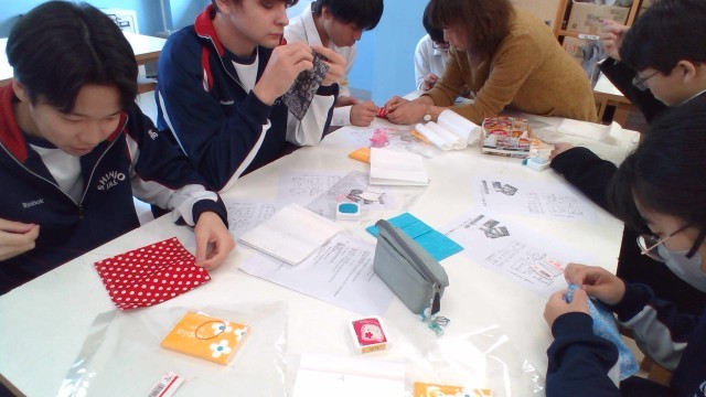 2年生ではものづくり教室を行いました。講師の方々から丁寧に教えていただき、ポケットティッシュカバーを作成しました。実用的な作品が完成したので、毎日持ち歩いてほしいと思います!