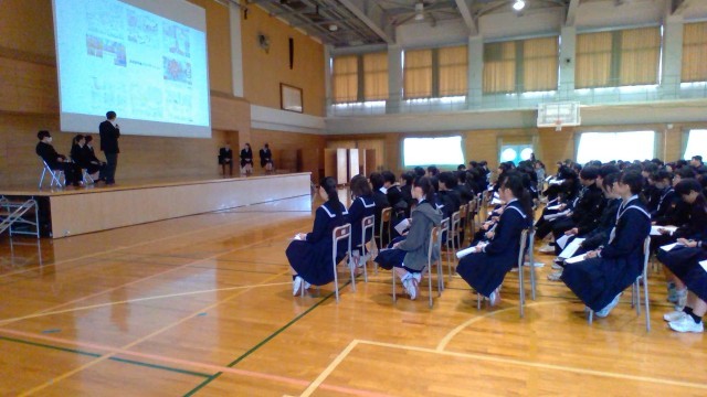 5,6限に「高校生に学ぶ会」がありました。新庄中を卒業され、現在は高校2年生の先輩7名の方々のお話を聞きました。生徒たちは、メモを取りながら真剣に先輩方の話を聞いていました。1年後の進路選択に向けて、一人一人がこれから準備していこうという気持ちを高めることができました。