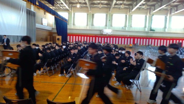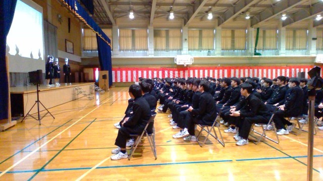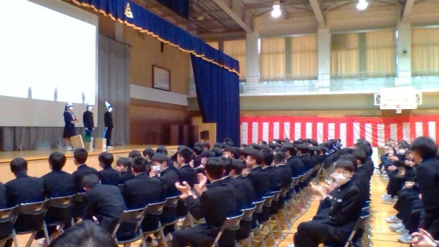3月11日(水)卒業を祝う動画披露 公開日 2026/03/11 更新日 2026/03/11 その他 予行の後、3年生への感謝を込めて生徒会が中心となって企画・製作した「卒業を祝う動画」を全校で見ました。心のこもった映像と楽しい演出で3年生は大盛り上がり!終了後に退場する1・2年生に、3年生の座席から「ありがとう!」「めっちゃ楽しかった!」という声と拍手が寄せられ、1・2年生は少し照れながらも満足そうな表情を見せていました。 +1