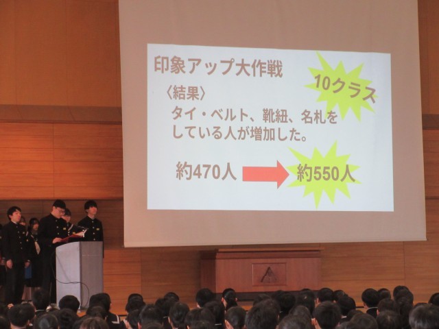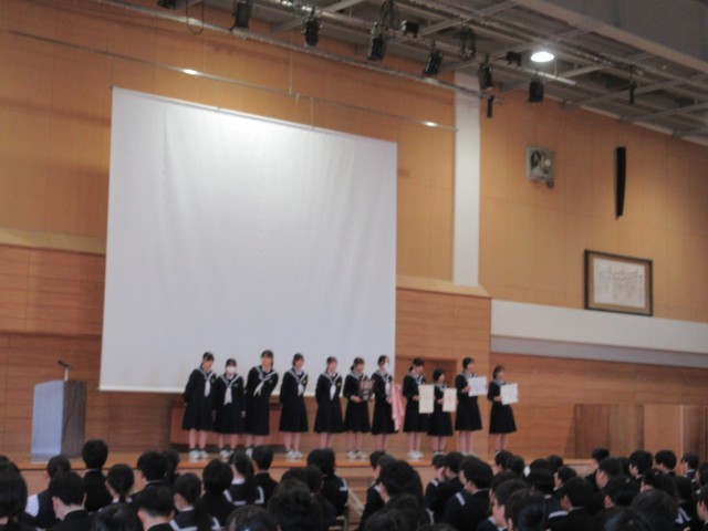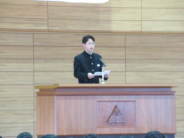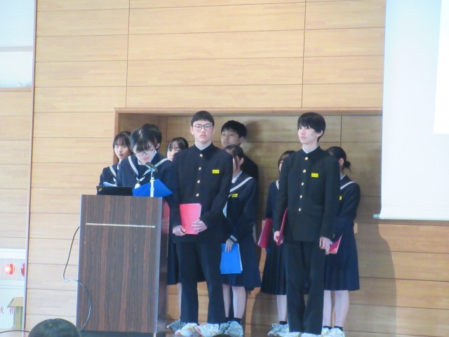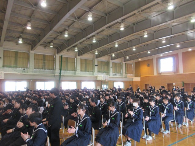 3月24日(火)受賞報告、生徒会報告、意見発表 公開日 2026/03/24 更新日 2026/03/24 学校行事 修了式に先立って、受賞報告・生徒会報告・意見発表を行いました。それぞれの立場で全力を尽くし、堂々とした姿でステージに立つ生徒たちの輝く表情が印象的でした。 +3 1年生 2年生 3年生 学校行事 授業参観 PTA