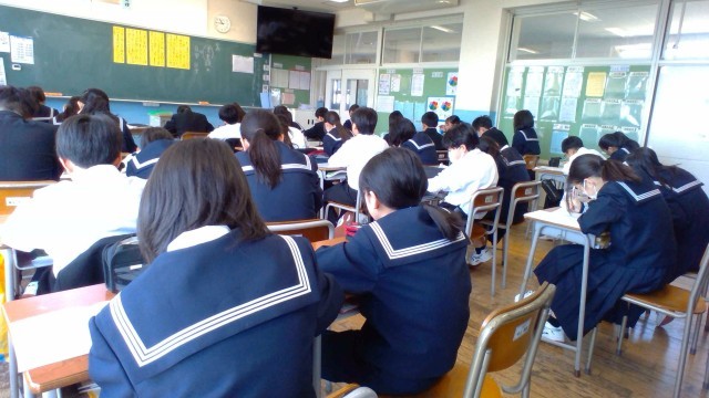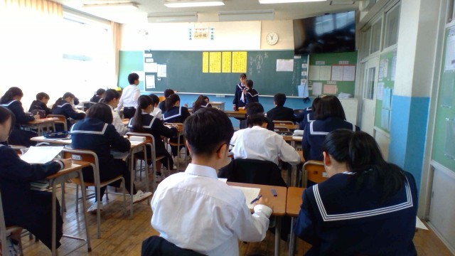 3限に、1年生の国語で「中学生になって」の作文を書きました。中学校に入学し、新しく出会った仲間に自分を知ってもらい、互いに応援し合うクラスにしようと、一生懸命に取り組んでいます。相談の時間に友達と意見交換したり、教卓に置いてある辞書で分からない漢字を調べたりと、よりよい作文にするために努力する姿が見られました。発表会が楽しみです。