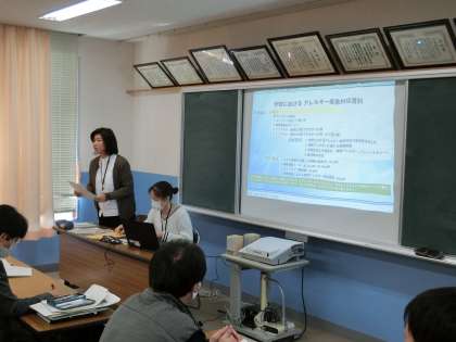 本日は、食物アレルギーへの対応について確認しました。アナフィラキシー発症の対応や救急搬送時の対応について、実際の場面を想定した動画を活用して研修を行いました。