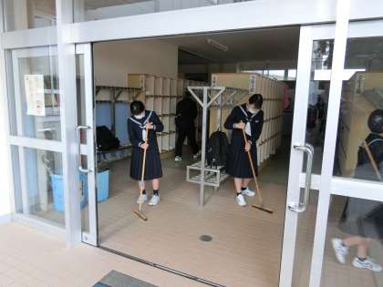 生徒玄関では、美化委員会が朝清掃を行っていました。そのおかげもあって、生徒はみんな笑顔で登校しています。