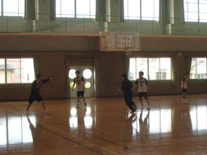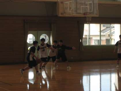 対外試合ができないため、校内での試合を行っています。人数が足りないところに顧問の先生が2人入っています。動きながら指導していて、生徒以上にアグレッシブな先生方です。生徒も負けていられませんね。