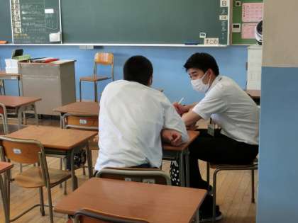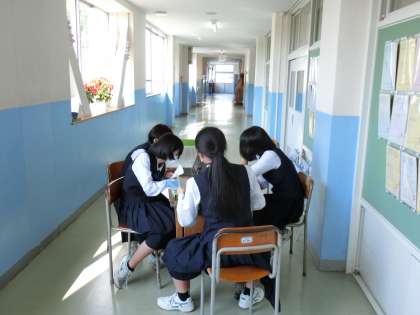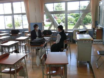 今日はノー部活動デーで、各教室では教育相談を行いました。担任の先生と一人ずつ落ち着いた雰囲気の中で面談をしていて、生徒の表情には時折笑顔が見られました。廊下では、勉強しながら自分の順番を待っている生徒も見られました。