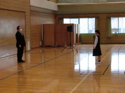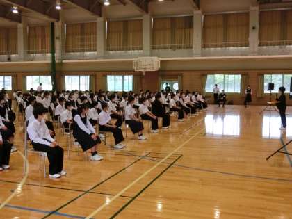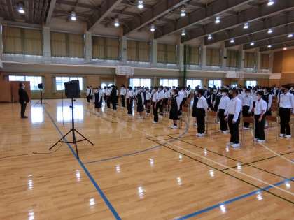 1年 校外学習の結団式 公開日 2021/06/08 更新日 2021/06/08 1学年 6月8日(火)4限 1年生は、明日の校外学習に向けて、体育館で結団式を行いました。代表生徒が校長に決意を述べた後、全員で「いってきます」と元気に挨拶しました。引率の団長である教頭が、「安全を最優先にして、友達への気遣いを大切に行動しましょう」と生徒に伝えました。