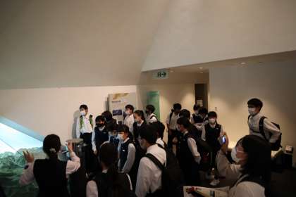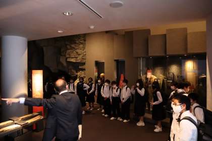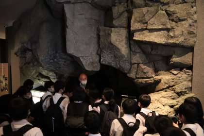 4組です。立山博物館の館内で学芸員さんの話を真剣に聞いています。 立山信仰や立山の自然について学びが深まっています。