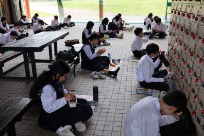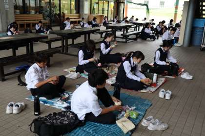 感染防止対策のため、間隔を空け同じ方向を向いての食事をとっています。