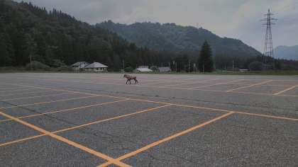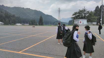 1、2組です。昼食を食べて大山農山村センターを出発しようとしたとき、駐車場の奥の方に鹿が現れました!