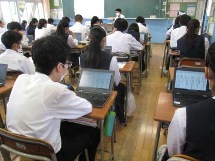 3年 合唱コンクールの選曲の時間 公開日 2021/06/25 更新日 2021/06/25 3学年 6月25日(金)6限 総合的な学習の時間 各生徒がクロムブックを開いて、歌詞を確認しながら、学年の放送で曲を聴きました。アンケートも入力画面から済ませました。集計結果をもとに、各クラスが歌う曲は1学期中には決定する予定です。