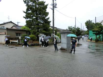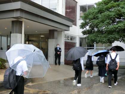 早朝から強い雨でしたが、生徒が登校するこの時間は小降りになっています。
