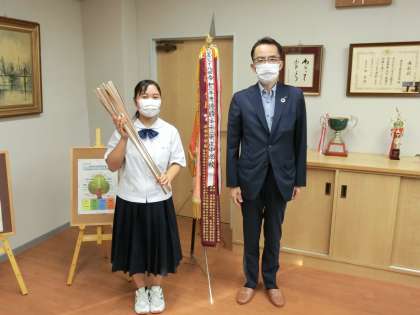 新庄校区の自治振興会会長の菱田さんが、先月行われた富山県でのオリンピック聖火リレーである“トーチキス”に参加されました。そのときに使用した聖火ランナーのユニフォームと聖火トーチを本校生徒や来客者に見ていただくことができるよう、お借りすることができました。お借りした際、本校代表生徒が、菱田さんに聖火リレーに出場するまでの経緯や思いをインタビューしました。