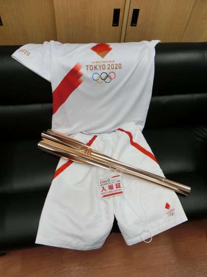 インタビューの様子は、明日の給食時間の校内放送でお伝えする予定です。また、聖火トーチや聖火ランナーのユニフォームは、明日から終業式の7/21(水)まで展示いたしますので、ぜひご覧ください。