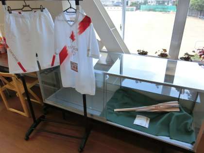 聖火ランナーのトーチとユニフォーム 公開日 2021/07/13 更新日 2021/07/13 そ の 他 7月13日(火)14:00 昨日お借りした、東京オリンピックの聖火ランナーが持つトーチとユニフォームを、写真のように、校長室前に展示しました。前を通りかかる生徒は、「うわぁ〜すごいなぁ」と興味津々で見ていました。