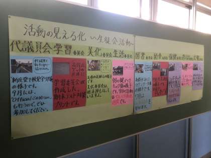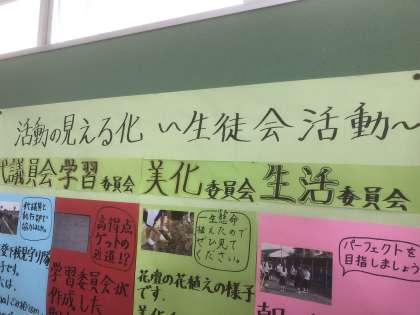 生徒会の取組の様子を知ってもらうため、生徒玄関に執行部や委員会の活用の様子を「活動の見える化」の一環として掲示しています。
