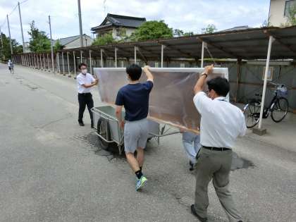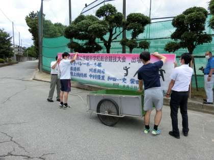 やや風の強い日ですが、校門前の植え込みに北信越大会に出場しますバレーボール部、柔道部、陸上競技部の選手を激励する看板を設置することができました。