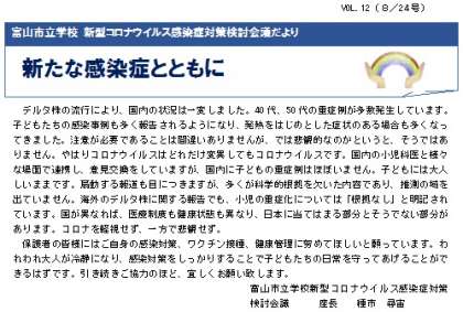 「新型コロナウイルス感染症対策検討会議だより VOL.12 新たな感染症とともに」をHP画面右側「配布文書」に載せましたのでご覧ください。
