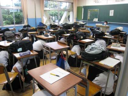 シェイクアウト訓練 公開日 2021/09/01 更新日 2021/09/01 そ の 他 9月1日(水)終礼 防災の日の取組として、地震を想定したシェイクアウト訓練(机の下への避難)を行いました。いざというときに自分の身を守る行動がとれるよう、真剣に取り組みました。
