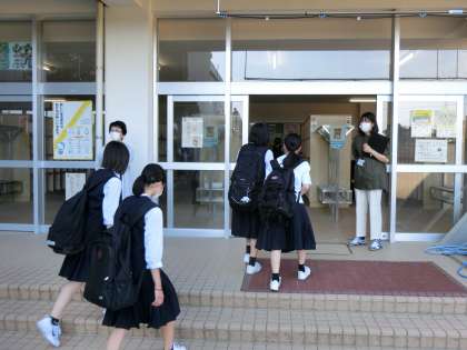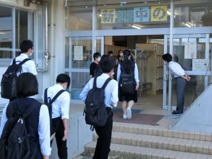 朝の登校風景 公開日 2021/09/10 更新日 2021/09/10 そ の 他 9月10日(金)8:00 快晴のさわやかな朝になりました。2学期が始まって今日でちょうど2週間、生徒は元気に登校しています。