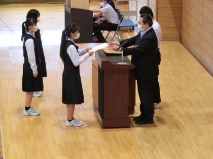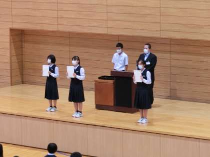 後期生徒会役員認証式 公開日 2021/10/01 更新日 2021/10/01 生徒会 10月1日(金)13:40 後期生徒会役員の認証式を行いました。校長から後期生徒会長と副会長2名に認証書が授与されました。