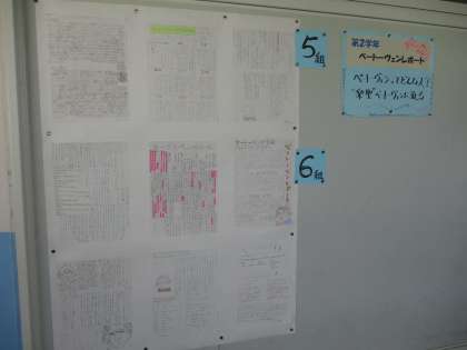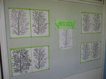 作品展示の様子です。 1・2年全員の夏休みの自由研究(理科)や科学展入選作品等も理科室に展示してあります。