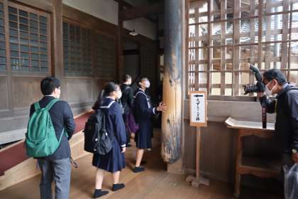 3学年 修学旅行代替行事(4組) 公開日 2021/11/01 更新日 2021/11/01 3学年 4組です。 永平寺を参拝してきました。 山門は、修行に来ておられるお坊さんは人生に二度しか通ることはなく、修行に来た時と修行を終えた時だけ通ることなどをガイドさんから教えていただきました。 すりこぎ棒がありますが、触るとお料理の腕があがるとか…。 この後、勝山方面に向かい、昼食となります。