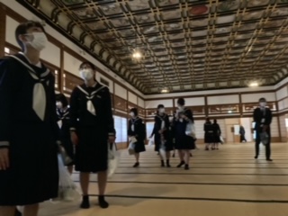 5組です。永平寺にいます。伽藍の中を見学しています。静かに落ち着いて見学しています。