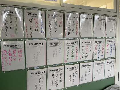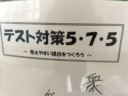 校内の掲示物紹介「テスト対策5・7・5(川柳)」その1 公開日 2021/11/25 更新日 2021/11/25 3学年 3年生のあるクラスの廊下には、テスト対策として暗記したい重要語句を入れた川柳(5・7・5)がテスト対策として掲示されています。