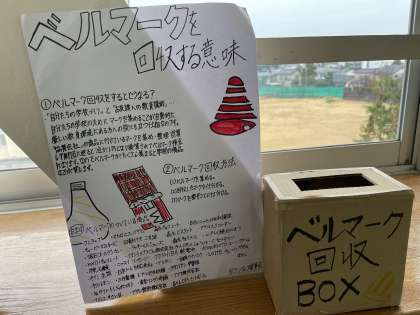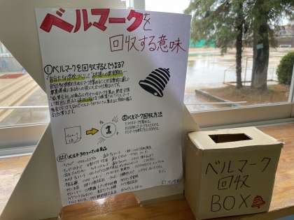 各学年の階には、ベルマークを回収する意味について説明する手作りポスターと一緒に、回収箱が設置されています。