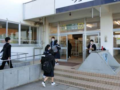 11月30日(火)8:00 今朝も快晴ですが、冷え込みました。生徒は寒さに負けず、元気に登校します。