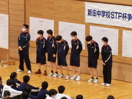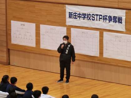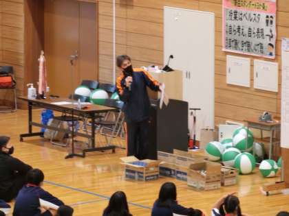 SPT杯争奪ビーチボール大会1 公開日 2021/12/04 更新日 2021/12/04 そ の 他 12月4日(土)9:00 本校PTAが主催する「SPT杯ビーチボール大会」が本校体育館にて行われました。S(生徒)13チーム、P(保護者)2チーム、T(教員)1チーム、合計100名あまりが参加して楽しいひとときを過ごしました。 最初にPTA会長が挨拶した後、父親委員長がルール説明し、代表生徒チームが「受検のことを忘れ、日頃たまったストレスを発散します」と選手宣誓をしました。