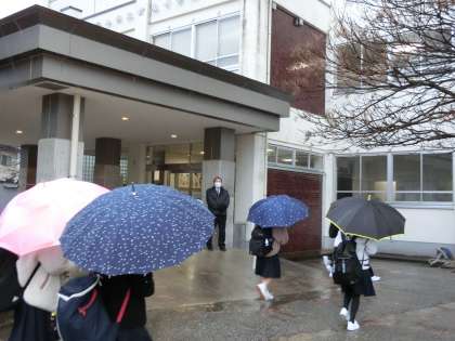 朝の登校風景 公開日 2021/12/08 更新日 2021/12/08 そ の 他 12月8日(水)8:05 今週に入って雨の朝が続いています。生徒はいつもより早く登校し、足早に校舎に入っていきました。今日は放課後に代議員会・専門委員会が行われます。