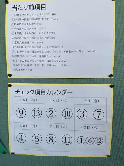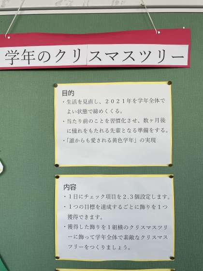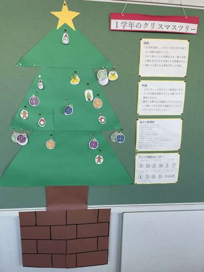 校内の掲示物紹介「1年生のクリスマスツリー」 公開日 2021/12/20 更新日 2021/12/20 1学年 1学年は、2学期の締めくくりとして「当たり前の事を習慣化する」をねらいとして、毎日、2項目〜3項目の事をチェックし、達成ごとにモニュメントをツリーに飾っています。 12月20日は、 項目4 「全時間ベルスタ パーフェクト」 項目5 「4限後15分以内にいただきます」 です。