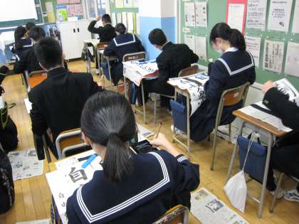 2年生 書き初め大会1 公開日 2022/01/11 更新日 2022/01/12 2学年 1月11日(火) 今日から3学期が始まり、始業式後書き初め大会を行いました。今年の二年生の書き初めの課題は「自由創造」となっており、行書という慣れない書き方にも挑戦しながら、真剣に取り組んでいました。 上:2-1 中:2-2 下:2-3