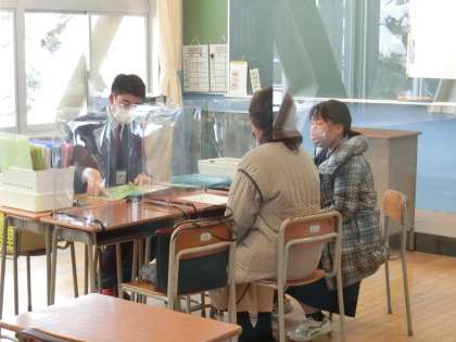 3年 進路懇談会1 公開日 2022/01/12 更新日 2022/01/12 3学年 1月12日(水)15:15 3年生は今日の午後から進路懇談会を行っています。寒い日ですが、進路決定に向けて生徒・担任・保護者が熱い思いをもって相談していました。