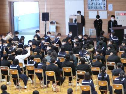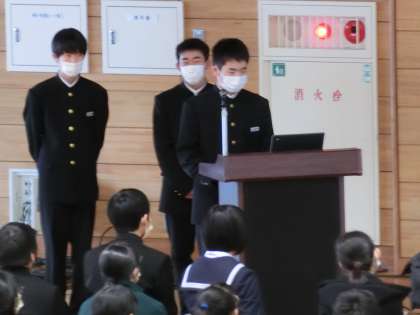 「社会に学ぶ『14歳の挑戦』」1・2年生合同発表会3 公開日 2022/01/20 更新日 2022/01/20 学校行事 3番目はスーパーでの体験を発表しました。スーパーでの仕事内容をクイズ形式で1年生に紹介しました。