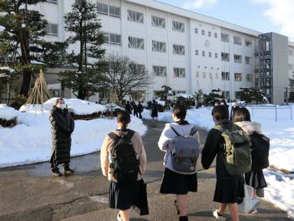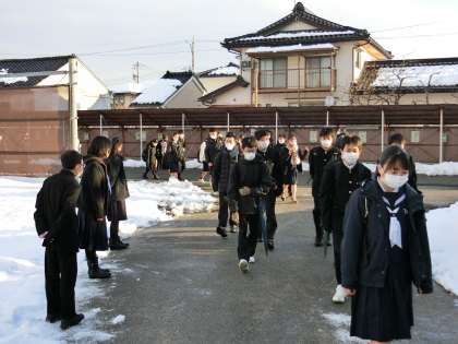 朝の登校風景 公開日 2022/02/09 更新日 2022/02/09 そ の 他 2月9日(水)8:00 路面が凍結していますが、青空の広がる朝です。校地内では、各クラスの学級代表による挨拶運動を行っており、元気な挨拶が飛び交っています。