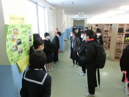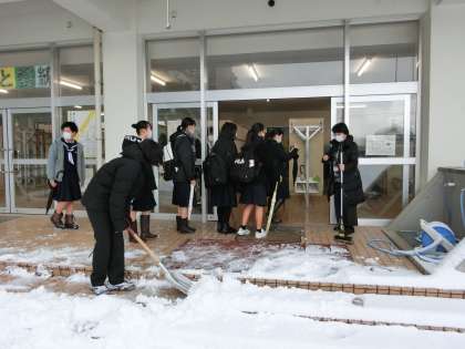 生徒玄関では、生徒会執行部による挨拶運動が行われ、その取組の反省会を行っていました。
