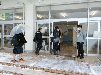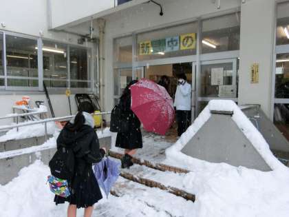 昨日に引き続き雪の朝です。生徒は風雪を防ぎながら登校しています。今日から3日間(3年生は2日間)、学年末評価が実施されます。