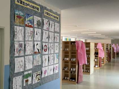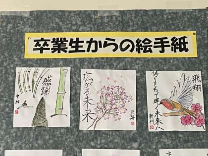 3年生卒業制作「卒業生からの絵手紙」 その1 公開日 2022/03/11 更新日 2022/03/11 3学年 3年生が感謝の気持ちを込めて作成した「絵手紙」が、生徒玄関や渡り廊下に掲示してあります。 卒業生の温かい気持ちが、在校生にしっかり伝わっていると思います。